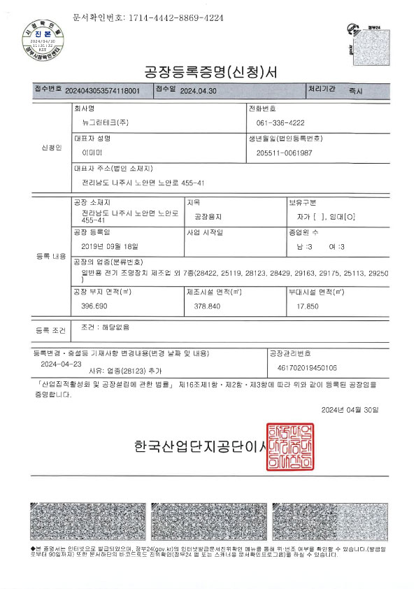 뉴그린테크 공장등록증명서