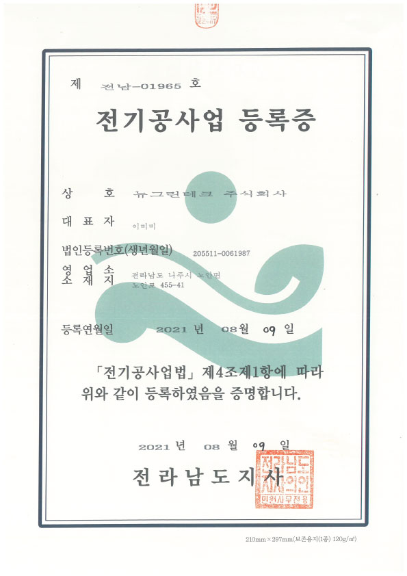 뉴그린테크 전기공사업 등록증